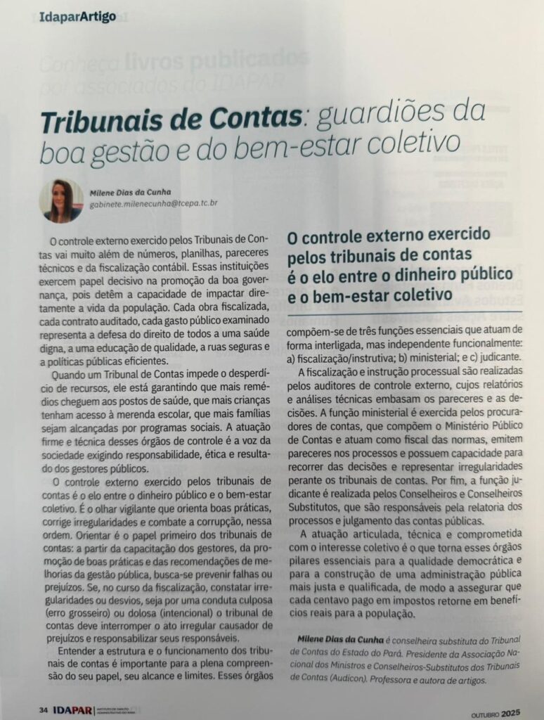 A presidente também é uma das autoras da publicação, com o artigo “Tribunais de Contas: guardiões da boa gestão e do bem-estar coletivo”, no qual aborda a importância do controle externo como instrumento de transparência e de fortalecimento da governança pública.