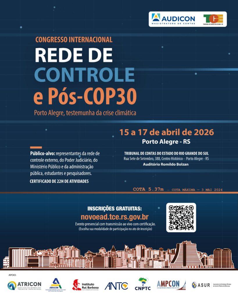 Entre os dias 15 e 17 de abril de 2026, a cidade de Porto Alegre sediará o Congresso Internacional Rede de Controle e a Pós-COP30, que será realizado no Auditório Romildo Bolzan, na sede do Tribunal de Contas do Estado do Rio Grande do Sul (TCE-RS).