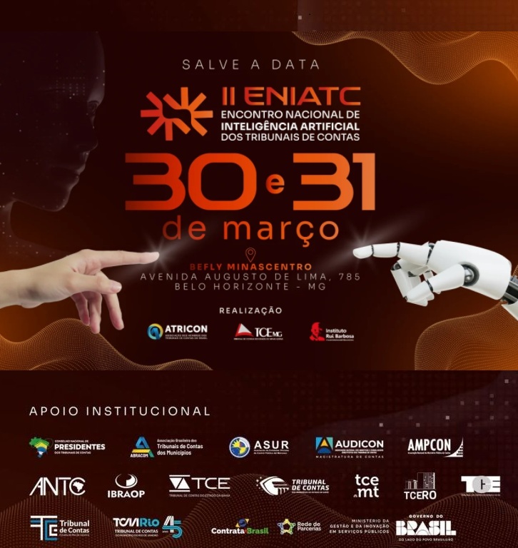 O II Encontro Nacional de Inteligência Artificial dos Tribunais de Contas (ENIATC) ocorrerá nos dias 30 e 31 de março de 2026, em Belo Horizonte (MG), reunindo membros e servidores dos Tribunais de Contas, gestores públicos, pesquisadores, especialistas, representantes do setor privado, profissionais de tecnologia, dados e inovação, além de estudantes e convidados de todo o país. O evento buscará discutir o papel da inteligência artificial no fortalecimento do controle externo e na modernização da gestão pública.